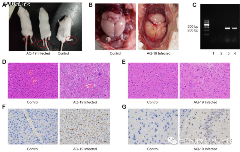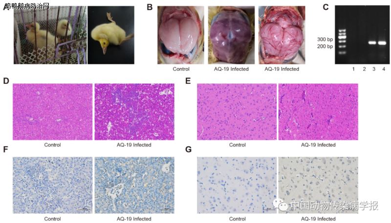 为了进一步研究AQ-19株鸭坦布苏病毒的致病力。作者利用雏鹅和ICR小鼠进行鸭坦布苏病毒致病性试验。试验结果表明,感染病毒的雏鹅表现出腹泻、瘫痪、厌食、角弓反张、共济失调等典型症状,死亡率较高。组织病理学研究表明雏鹅肝细胞变性坏死,脑部组织有血管袖套、血管周围的淋巴细胞浸润和神经元坏死等病理变化;通过颅内攻毒的小鼠表现出毛发皱褶、体重减轻和后肢瘫痪,组织病理学变化与雏鹅类似。