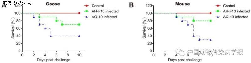 最后作者通过比较以往中国分离株AH-F10与此分离株AQ-19对雏鹅和小鼠致病性差异,发现感染AQ-19 鸭坦布苏病毒的鹅群死亡率达60%,小鼠死亡率达70%,而感染AH-F10鸭坦布苏病毒的鹅群死亡率只有30%,小鼠死亡率为20%。