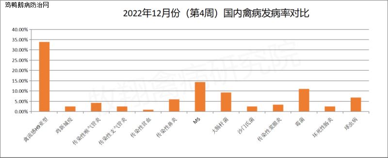 根据12月份第4周国内禽病发病率统计分析:本周国内主要病毒性疾病如禽流感H9亚型、新城疫、传染性支气管炎、传染性喉气管炎、鸭产蛋下降综合征等病的发病率与上周相比整体呈现下降趋势,细菌性疾病如大肠杆菌、沙门氏菌、传染性浆膜炎等的发病率略微上升。