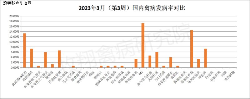 本周鸡滑液囊支原体(MS)发病率最高,最近在蛋鸭也有MS感染发病现象;驰骋禽病研究所魏智慧老师分析MS已经成为鸡底色病。