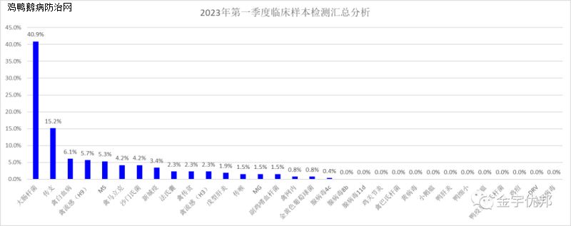 2)第一季度检出排名前5的疫病依次为大肠杆菌病(40.9%)、传染性支气管炎(15.2%)、白血病(6.1%)、禽流感H9(5.7%)、滑液囊支原体(5.3%);5种疾病占确诊疾病的总体比例在73%左右。本季度大肠杆菌病、禽白血病的检出比例有所上升;