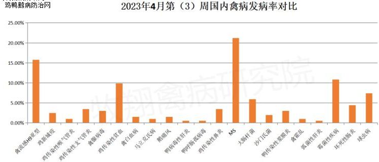 根据4月份第3周国内禽病发病率统计分析:本周H9N2发病率为15.76%,比上周环比下降了2.76个百分比。