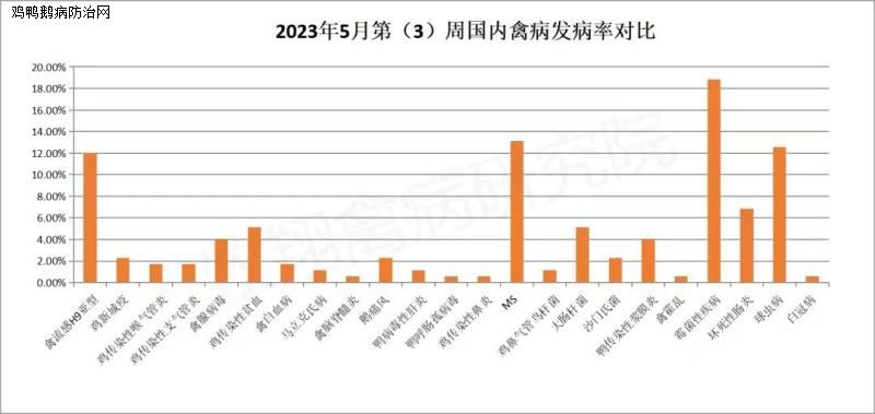 进入5月份第3周以来,全国气温有明显回升,早晚温差进一步减小,但是中午温度多在30℃以上,容易造成鸡群热应激。从本周统计的发病率数据分析,目前国内主要病毒性的发病率均出现下降趋势,细菌性疾病的发病率有所上升,特别是肠道疾病的发病率快速上升。