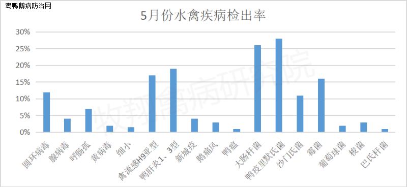 驰骋禽病研究院5月份收到的水禽病病料检测结果,对本月水禽疾病检出率进行简单分析,将病毒性、细菌性疾病分类进行阐述。