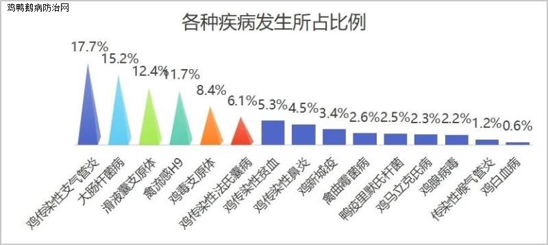 (1)流行疾病中的传支、支原体病、大肠杆菌病、禽流感H9、白冠本、鸡痘等在一定时间内仍会维持在较高的发病比例。