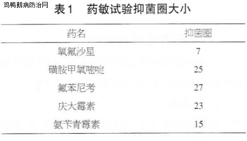 根据药敏试验,选用普疾宁(10%氟苯尼考溶液) 每瓶兑水200斤,新力爽1袋兑水400斤,混合饮水5天,病情得到控制,3天后日死亡率降至0.2%,4天后基本上停止死亡。