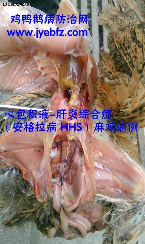 是由腺病毒引起,主要引起肾炎、包涵体肝炎、心包积液、产蛋下降综合征等。腺病毒腺病毒分为Ⅰ、Ⅱ、Ⅲ亚型,Ⅰ亚型不见,Ⅱ亚型(火鸡出血性肠炎和相关病毒),Ⅲ亚型就是近期闹的沸沸扬扬的肾炎、产蛋下降综合症、包涵体肝炎以及心包积水综合症(因其最早爆发于巴基斯坦卡拉奇的安格拉,因此最早称为安格拉病)。 由于在肉鸡养殖业中本病多与其它鸡病(速发型新城疫、支原体病、沙门氏菌病、马立克氏病和禽流感等)并发,则难以评估本病造成的直接经济损失。某一地区HHS的流行及严重程度与鸡的饲养密度有关。