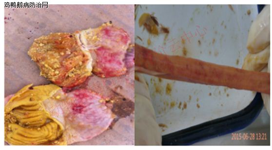 腺胃肿胀出血、肌胃鸡内金裂口较为突出,发病初期肠道黏膜肿胀,有西红柿样的粪便,中后期肠道黏膜充血、脱落;脾脏肿大;