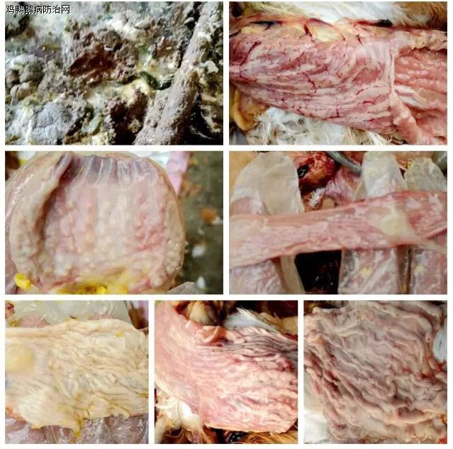 气管发红出血,腺胃乳头和基部轻微发红,胰腺边缘出血特别明显,鸡腹腔里面全是黄色干酪物,卵泡出现菜花状,盲肠扁桃体个别鸡只肿大出血,个别鸡只卵黄蒂下面两厘米处有轻微出现枣核状肿胀,输卵管水肿而且里面有白色分泌物,如图所示