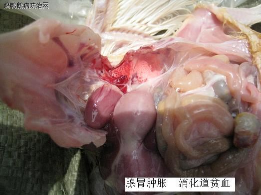 腺胃肿胀,腺胃乳头变平,界限不明显,肠道外观有不同程度的红点,出血斑。