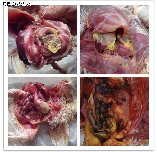 病鸡死亡急速,皮肤和肌肉淤血呈紫色,血液呈紫黑色,凝固不良。剖开腹腔可见肠黏膜弥漫性出血、充血,整个肠管呈现紫红色。肝肿大,切面外翻,呈紫红色或绿色,肝脏表面出现白色的小坏死灶,在肝表面形成的这种纤维素性膜有的呈局部发生,严重的整个肝表面被此膜包裹,此膜剥脱后肝呈紫褐色,肝肿大切面外翻,肾脏肿大,心包炎,个别鸡肠道黏连,严重的形成卵黄性腹膜炎。