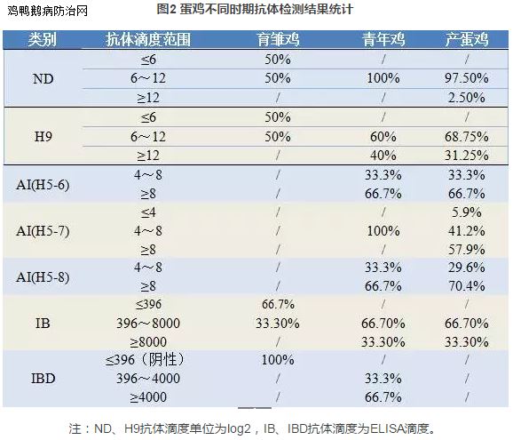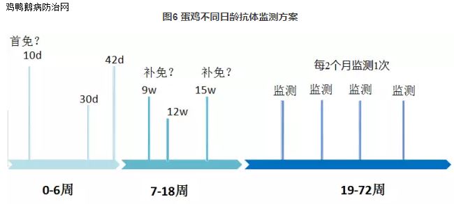 蛋鸡监测时间:7日龄之前(确定首免时间)、30日龄左右(确定二免时间)、60~90日龄(了解免疫效果)、产蛋前(了解鸡群状态)、产蛋期每隔2月监测一次(了解免疫效果,评价免疫程序),具体见图6;