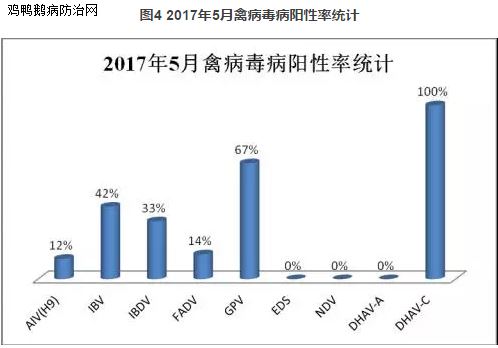 由检测结果可以看出(见图4),IBV、GPV的检出率最高,应引起高度重视,加强防控;AIV(H9)、 IBDV、FADV的检出率较高,是养殖场主要的疾病;由于鸭肝病毒(DHAV)的样品送检了1份,检出DHAV-C阳性,说明鸭肝C型比鸭肝A型相对流行;NDV、 EDS的检出率较低,当前发病率较低。