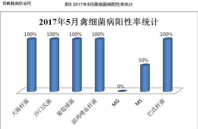 2017年5月,对送检样品进行大肠杆菌、鸡毒支原体(MG)、滑液囊支原体(MS)、副鸡嗜血杆菌杆菌、葡萄球菌、巴氏杆菌、沙门氏菌进行检测,由检测结果可以看出(见图5),目前鸡场大肠杆菌的送检率和检出率最高;MS、巴氏杆菌、副鸡嗜血杆菌、葡萄球菌、沙门氏菌的检出率较高,我们要加强对这些疾病的防控。