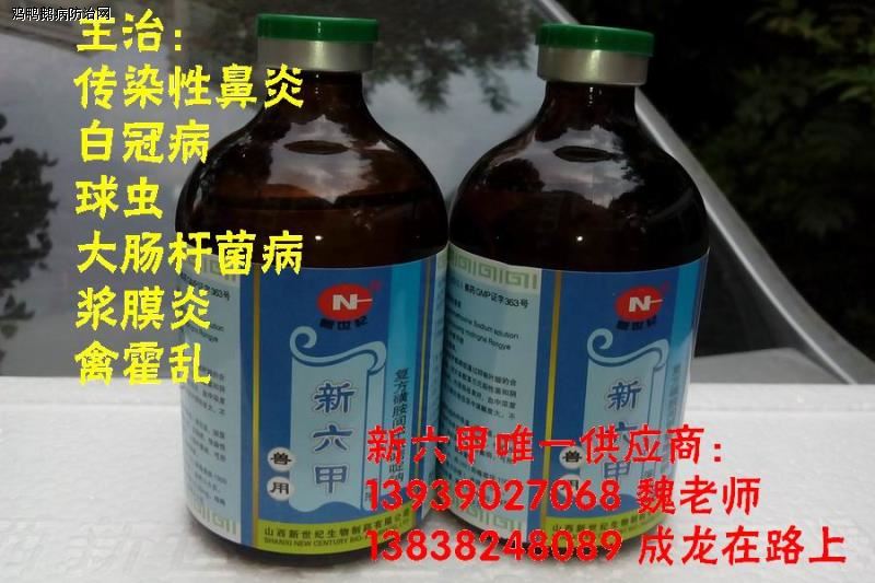鸡传染性鼻炎具体用药方案:“新六甲”+“新力爽”进行饮水给药,每天1次,连用4-5天;对挑选隔离的病鸡采用肌肉注射给药,每天1次,连用4天。① 新六甲成年鸡每瓶供1000-1500公斤体重鸡只,集中一次饮水,每日一次,连用5日,首次量加倍; 重病鸡,每公斤体重肌注0.2-0.3毫升, 每日一次,连用2-3日然后放回大群饮水。效果显著。