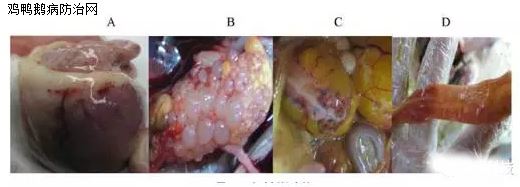 A心肌表面点状出血;B、C卵泡充血、出血、变性、萎缩;D肠道点状出血