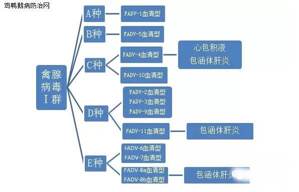 Ⅰ群腺病毒分A、B、C、D、E五个基因型(种),12个血清型。其中鸡12个血清型FADV1-12、火鸡2个血清型FADV1-2、鹅3个血清型FADV1-3、鸭2个血清型。