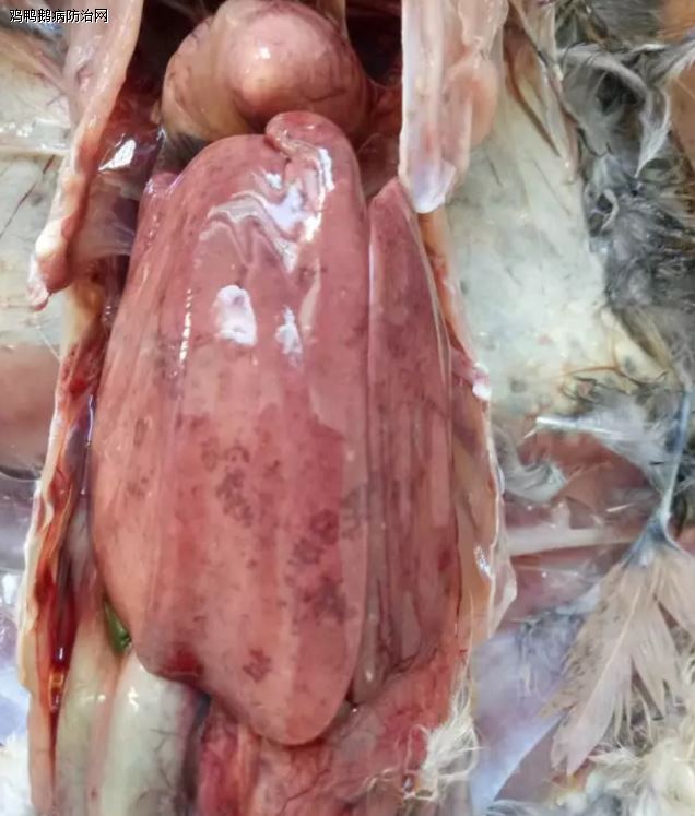发病情况:散养土鸡,每天死亡3,5只,剖解除了肝脏变化外,还有肠道出血较严重。