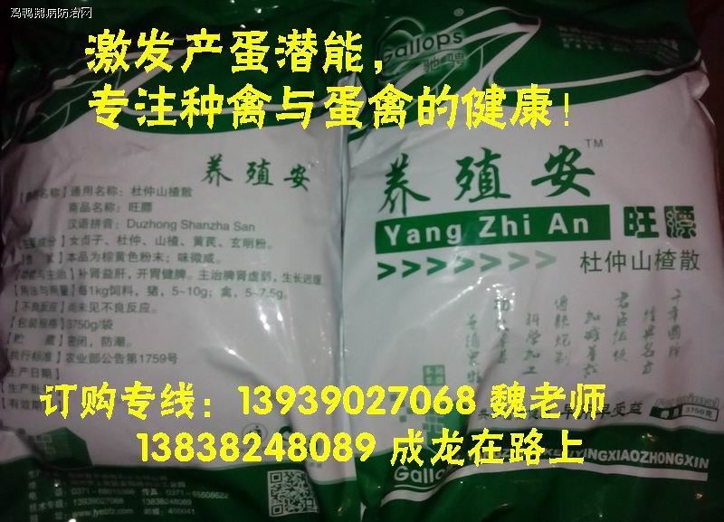 新型无抗纯中药发酵制剂——驰骋养殖安代替抗生素添加剂,在减少产蛋鸡大肠杆菌(长期使用养殖安对家禽体内大肠杆菌的抑制率达98.8%以上)、沙门氏菌等细菌病的发生,抗球虫(定期使用0.75%养殖安,可大大避免球虫病、过料等问题的发生);提高产蛋鸡的抗病能力,发挥产蛋鸡的高产性能等方面已得到了较好的推广应用效果,并且在使用中取得了明显的经济效益和良好的社会效益。种鸡、种鸭:对种蛋合格率、孵化率、受精率、死陶率等效果显著,用养殖安1次见效,用1月叫好,用2个月后让您的种禽无可挑剔!!!种禽专业技师:13939027068 13838248089