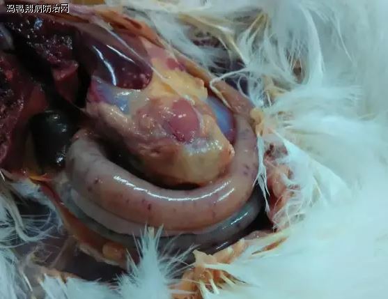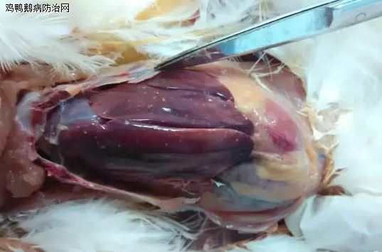 病鸡腹膜、腹部脂肪、皮下组织有小的出血点,心包内有多量淡黄色液体,心冠脂肪出血明显,肝脏有针尖样白色坏死点肠道浆膜、肠黏膜出血等,部分解剖图片如下图: