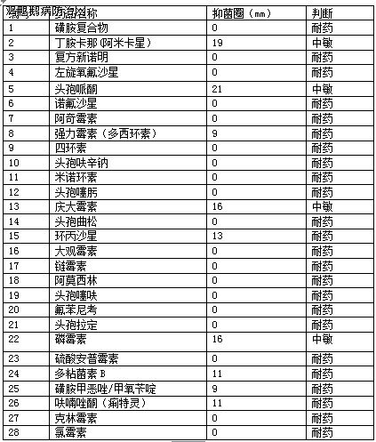 使用体外敏感药物筛选试验筛选敏感抗生素头孢哌酮治疗,同时选用和引起本场发病的巴氏杆菌菌株血清型高度匹配的相应蜂胶灭活疫苗免疫鸡群,在免疫后的第10天按每3天递减1/3的减量方式逐渐停用抗生素,鸡群死亡数量降到每日2-3只,后随访3个月未有病情复发。药敏试验如下: