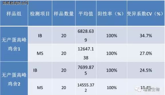 取10只剖检鸡的气管、肺脏、肝脏、脾脏、肾脏、踝关节、输卵管等器官送众联监测中心进行病原菌的分离鉴定,同时从发病鸡舍采集血清20份,进行IB和MS抗体水平测定,结果如下: