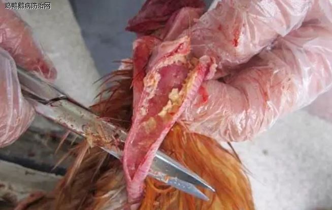剖检一只有呼吸道症状伸脖张口呼吸的病鸡,可见下呼吸道气管环状发红、出血、喉头没有明显的针尖出血,卵泡没有受到丝毫的影响,只有直肠有出血;后来解剖一只死鸡主要典型病变在气管和喉部组织,出血和坏死。气管中有含血黏液或血凝块,气管下端管腔变窄,卵泡有变形,胰脏边缘有出血,肠道出血,直肠也有出血。