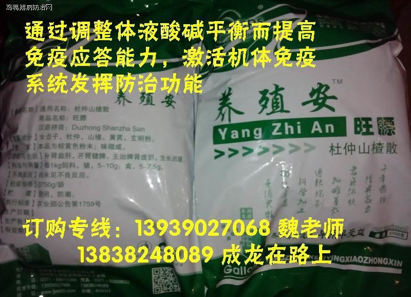 新型无抗纯中药制剂——驰骋养殖安(杜仲叶提取物)代替抗生素添加剂,在减少产蛋鸡大肠杆菌(长期使用养殖安对家禽体内大肠杆菌的抑制率达98.8%以上)、沙门氏菌等细菌病的发生,抗球虫(定期使用0.75%养殖安,可大大避免球虫病、过料等问题的发生);提高产蛋鸡的抗病能力,发挥产蛋鸡的高产性能等方面已得到了较好的推广应用效果,并且在使用中取得了明显的经济效益和良好的社会效益。种鸡、种鸭:对种蛋合格率、孵化率、受精率、死陶率等效果显著,用养殖安1次见效,用1月叫好,用2个月后让您的种禽无可挑剔!!!无抗养殖保健专业技师:魏老师在现场13939027068 成龙在路上 13838248089