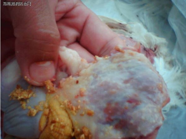 (3)、病鸡呈现消瘦,肌肉苍白,胸腺、法氏囊萎缩,嗉囊扩张,内有黑褐色米汤样物;胆囊扩张为暗绿色,胆汁外溢;