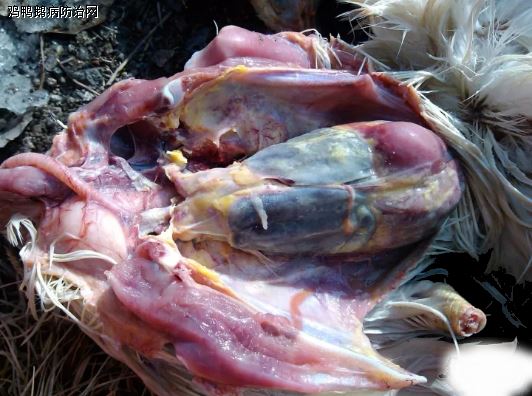 【解 剖】死亡鸡多以小鸡干爪脱水为主,解剖表现包心、包肝、气囊炎等症,气管粘膜出血,肺呈暗紫色,肾稍微肿胀出血。