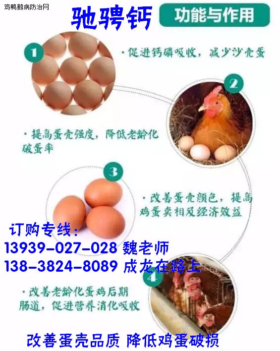 驰骋钙:您身边的补钙专家,2天见效! 1.有效预防“产蛋疲劳症”,即半夜突然发病,两腿僵直后伸,难产、瘫痪等症。2.快速改变蛋壳颜色,发红发亮,好看;3.增加蛋壳厚度,增重;4.减少薄壳蛋、软壳蛋,手触摸鸡蛋手感好,光滑、有质感,提高卖相--驰骋钙。www.jyebfz.com 鸡鸭鹅病防治网 魏老师用心推荐 13939-027-068 微信同步;成龙在路上推广分享 138-3824-8089.