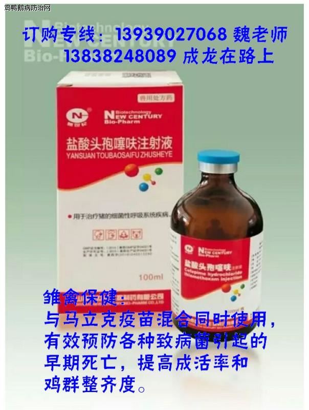 0日龄雏鸡出壳,取10 ml头孢噻呋钠注射液用生理盐水稀释,配合马立克疫苗颈部皮下注射1200只,彻底净化垂直传播的支原体。或1日龄雏鸡,10 ml头孢噻呋钠注射液用40毫升专用稀释液稀释后可配合油苗,颈部皮下注射1200只。