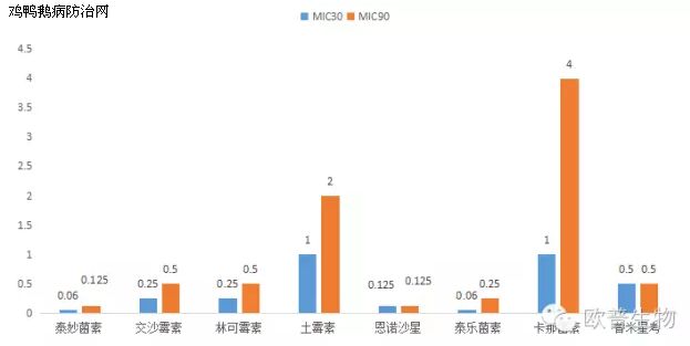 最小抑菌浓度(MIC):在特定环境下孵育24小时,可抑制某种微生物出现明显增长的最低药物浓度即最小抑菌浓度,用于定量测定体外抗菌活性。从图中看出泰妙菌素的使用最小的药量即能发挥最大的作用,证明泰妙菌素的效力强大。