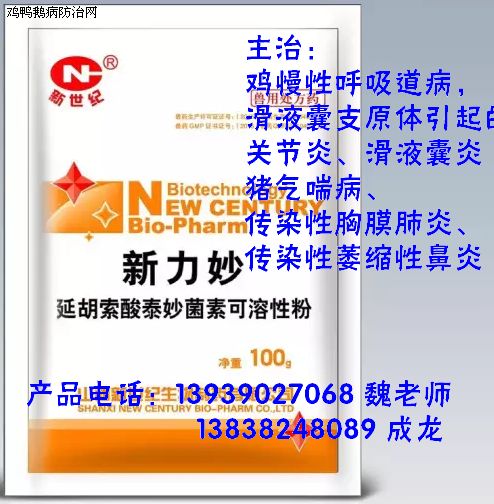 近几年市场上鸡滑液囊支原体、鸡毒支原体高发,给养殖业造成一定的损失,严重影响养殖效益,鸡鸭鹅病防治网联合新世纪生物结合市场需求,全新推出国标新一代水溶性延胡索酸泰妙菌素可溶性粉,给您轻松养殖再添保障!