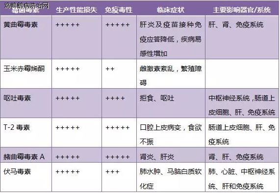 霉菌毒素是有部分霉菌在谷物、鱼粉等饲料中生长繁殖时产生的二次代谢有毒产物,它不同于霉菌,是霉菌活动的产物,仅靠肉眼不易发觉。并非所有霉菌都能产生毒素,但同一种毒素可由几种不同的霉菌所产生,而同一种霉菌又可产生几种不同的霉菌毒素。霉菌毒素的毒性有累加效应,但并非简单的相加或相乘关系。霉菌毒素的种类主要有黄曲霉毒素、赫曲霉毒素、玉米赤霉烯酮、呕吐霉素和T-2毒素等,现已经鉴定的霉菌毒素约有400多种。黄曲霉毒素可以攻击肝细胞的线粒体,导致肝细胞静止死亡:脂肪堆积形成脂肪肝,肝硬化导致肝衰竭;赭曲毒素会抑制尿酸排出,因此导致尿酸盐沉浊、肾肿大、肾纤维化及其他毒物无法排出;呕吐毒素可以刺激肠道黏膜发炎,破坏了肠道的正常生理结构,引起下痢;多重镰刀菌产生的T2毒素是一种腐蚀性刺激物,可造成腺胃、肌胃黏膜和羽毛上皮的坏死,引发胃酸分泌失常。霉菌毒素的毒性变化取决于毒素的种类、数量、摄入量、持续摄入时间、饲料营养水平、环境因素以及鸡的品种、日龄等等。