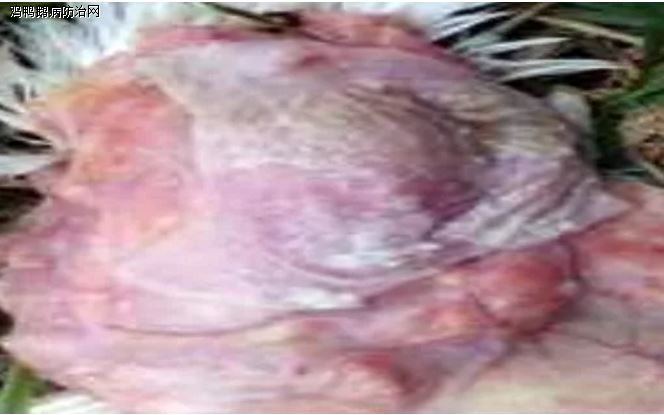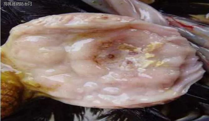 解剖检查急性中毒的病鸡可见胸腺和法氏囊萎缩,严重鸡只出现胸腺消失,法氏囊萎缩变性,内有灰红色的分泌物;嗉囊有一层白色念珠菌样伪膜;肝脏肿大(可为正常的2-3倍),表面可见不规则白色或灰白色坏死点或坏死灶,部分脂肪变性,上有肿瘤硬化,有黄染现象,偶见有呈青绿色或黑红色等,但大部分出现肝脏边沿变薄如刀刃,部分肝脏上有霉菌结节,慢性病例肝脏变硬,体积变小,呈土黄色;脾脏肿大、表面浆膜有大量灰白色坏死灶;胆囊肿大,心包及腹腔有少量积水,皮下常有胶冻样渗出物;肌胃严重溃烂,角质层皲裂,部分有火山口样溃疡灶,剥离角质层可见角质层与肌胃接触面有灰白色结节样霉菌斑,肌胃出血性溃疡,严重病例腺胃严重肿大呈椭圆型或梭形,腺胃壁增厚,乳头出血、透明肿胀,形似腺胃炎,但要注意区分;气囊增厚,内有云雾状病变;肠系膜变化类同,部分气囊、肠系膜出现明显霉菌结节;肺脏多成纤维素性肺炎,部分病死鸡肺脏可见灰白色霉菌结节;肠道黏膜脱落。