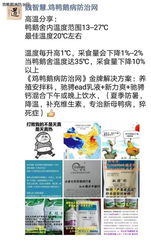鸭蛋价格走低,不管行情好坏,养好蛋鸭、肉鸭是关键,从今天开始,华北多地开启了高温模式,五一左右局部地区还有高达37℃的高温,高温来得如此之早,实属罕见!高温来袭、防控热应激、减少蛋鸭猝死症、瘫痪、产蛋下降等问题!魏老师推荐:解决热应激饮用新力爽+藿香正气口服液,拌料用养殖安+驰骋钙+生命核能,平安度过高温应激、稳定采食量、稳定产蛋率!魏老师 13939027068 微信同步 成龙在路上 13838248089 微信同步