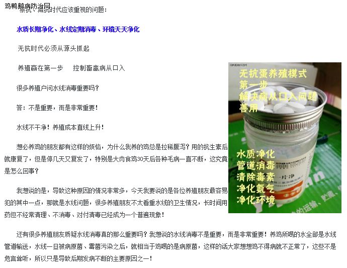 1、改善水质、清除毒素、净化养殖环境:用驰骋一片净,每周三定期消毒一次,即可达到净化养殖环境目的(祛除棚舍氨气、空气净化首选--驰骋一片净(减少呼吸道疾病传播))。经过数百家养殖企业使用证明:选用驰骋一片净,消毒效果好!对多种病毒、细菌、真菌有效率达93%-98.5%。畜禽养殖防控肠道病好用、有效、实惠、方便、便宜等特点的产品--驰骋一片净(10000只鸡1天只需25-30元的药费即可解决病从口入)老养殖朋友都在用,您还在等什么............