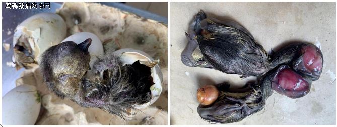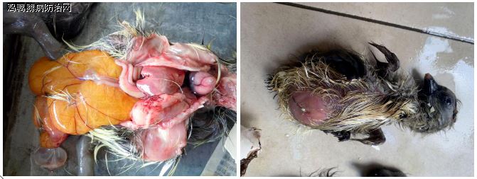 图:雏鹅表现为大肚脐肿胀、卵黄吸收不良
