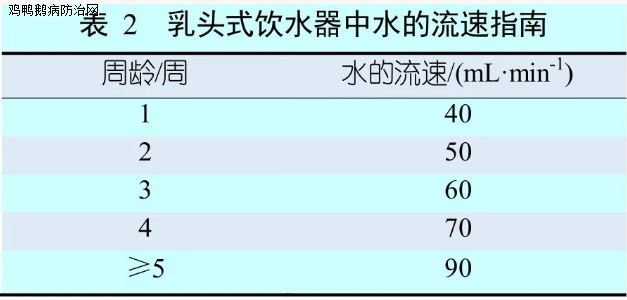 鸡场无论使用何种饮水系统或设备,只有管理得当,才能充分发挥它们的功能。给乳头式饮水系统配备便于肉鸡接近的360°乳头是首选。以每8~12羽鸡(低流量/高流量)配备一个饮水乳头的比率估测所需的乳头数。对这个配置进行任何的妥协都将会影响肉鸡的饮水量,进而会影响采食量和生长速度。饮水器的高度取决于肉鸡的年龄。首先,肉鸡的喙必须与地面成35°~45°,以便于它们饮水。随着肉鸡的生长,该角度可以增加到75°~85°,以避免水的溢出。如果饮水器的高度不适合,可以从肉鸡的行为和饮水规律中立即发现问题。测试饮水乳头提供的水量很重要。这由饮水乳头的类型、输水管道中的水压和饮水系统的清洁度决定。一种简单的测试方法是使用乳头流量计。根据肉鸡年龄计算的水流量可参考表2。