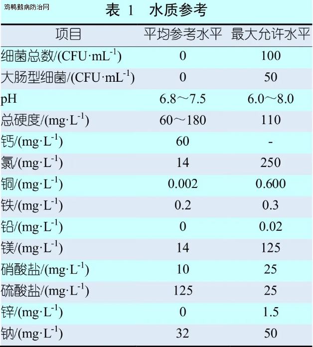 鸡场应每年至少采集两次水样(夏季1次,冬季1次),并检测水中微生物和矿物质的含量。水样应采集自饮水系统的起点和终点。在采样时需确保水的新鲜,因此采样前先让饮水系统运行几分钟。用无空隙的无菌容器采集水样,水样采集应后在24 h内送达实验室。表1所列出的数据可被用作评估鸡场水质的一个准则。