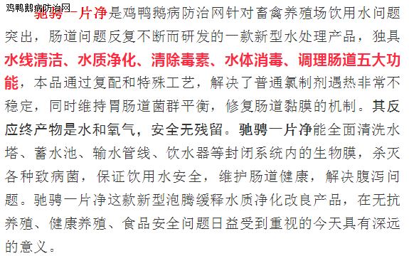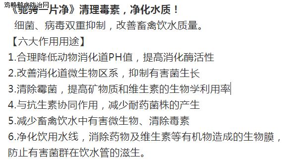1、改善水质、清除毒素、净化养殖环境:用驰骋一片净,每周三定期消毒一次,即可达到净化养殖环境目的(祛除棚舍氨气、空气净化首选--驰骋一片净(减少呼吸道疾病传播))。经过数百家养殖企业使用证明:选用驰骋一片净,消毒效果好!对多种病毒、细菌、真菌有效率达93%-98.5%。畜禽养殖防控肠道病好用、有效、实惠、方便、便宜等特点的产品--驰骋一片净(即可解决病从口入)老养殖朋友都在用,您还在等什么............