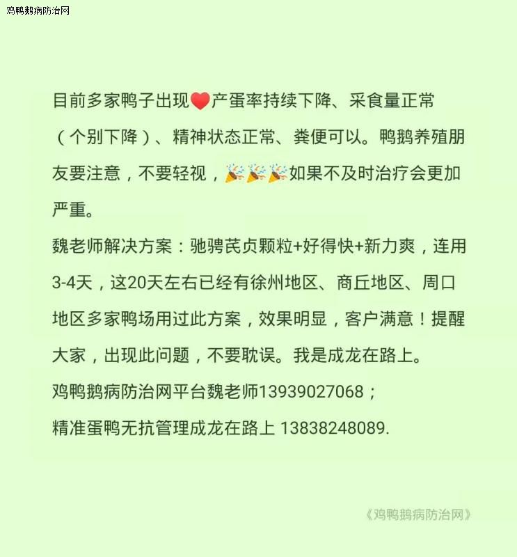 温馨提示:初冬时节、早晚温差大、防寒保暖很重要,同时不忘通风,请做好疫病预防管理工作,重视黄病毒、禽流感的防控,冬春季是鸭鹅产蛋下降、脾脏坏死、黄病毒、副粘病毒、浆膜炎等烈性传染病病的高发期,不可不防,近期产蛋下降、脾脏坏死、霉菌毒素流行泛滥。注意种鸭鹅产蛋下降、禽流感、黄病毒等水禽常见病的防控方案:养殖安+驰骋芪贞颗粒+新力爽+驰骋EAD乳液,混合饮水或拌料,每 月1-2次即可解决!防控禽流感、黄病毒效果就是不一样!水禽疫病实战专家魏老师提醒各位养殖朋友,防控黄病毒不可麻痹大意,要认真对待。 ‘