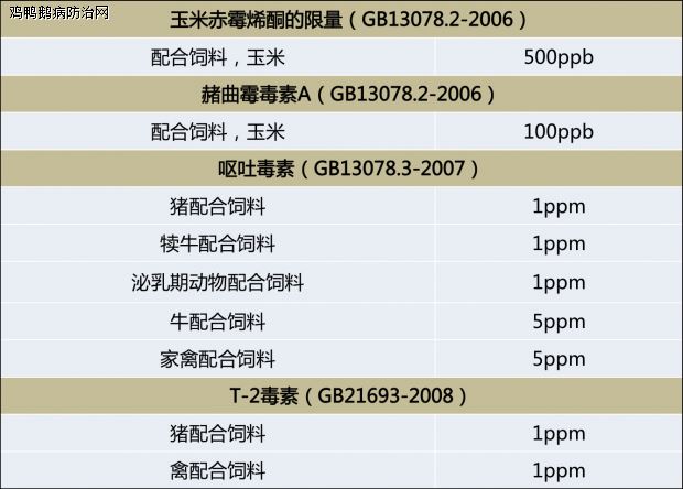 霉菌毒素具有累积效应,即使含量很低也会影响畜禽生长,因而没有安全量或最低标准。国标中关于霉菌毒素在饲料中的最高限量(注:1g=1000mg ,1mg=1000ug)