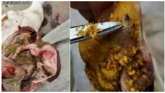鸭子吃料甩料,吐水,嗉囊很大快要垂到地上的感觉,这个很多时候都是和霉菌有直接关系,同时还伴随着吃料稍慢,鸭子炸炸翅膀,有伤亡的鸭子解剖可以看到霉菌斑,花肝、腺肌胃炎