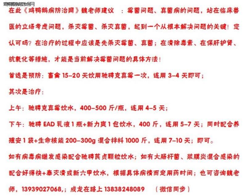 2、药物防控。定期饲喂治疗霉菌、保肝、解毒、增强免疫力的药物。如:驰骋克真霉、新力爽、2.0甘草、驰骋EAD乳液、黄芪多糖口服液、养殖安等。