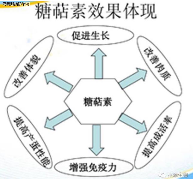 糖萜素中含有的有机酸,使动物消化道内环境偏酸化,同时糖萜素含有的寡糖类物质可以为双歧杆菌、乳酸杆菌等有益菌提供营养,促进其增殖。有益菌的增殖可以在肠道内产生大量的乳酸、丁酸等,降低肠道pH值,抑制有害菌和病原菌的生长,并减少有害物质氨气、吲哚等的形成,有利于动物肠道健康。保护精子和卵子,增加抗诱变能力,防止畸变和癌变,从而提高受精率,提高产蛋率和孵化率,提高仔畜禽的健康水平。