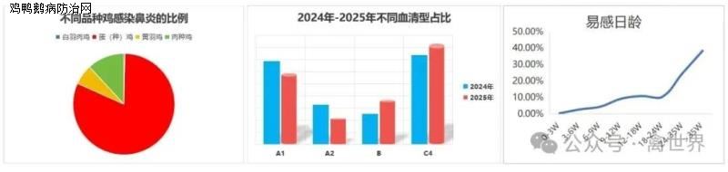 根据监测数据,目前鸡传染性鼻炎以蛋鸡和肉种鸡感染为主,但黄羽鸡也存在较高感染风险;鸡群从9周后,随日龄增加,易感性随之增加;流行的血清型主要是C4 型、A1型、B型和A2型。