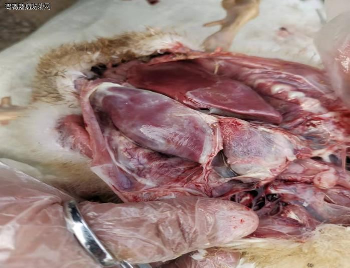 病理变化:脾脏出血斑、坏死灶,后期脾坏死、变硬、萎缩;肝脏肿大伴黄白色坏死点,法氏囊出血,胸腺肿大。
