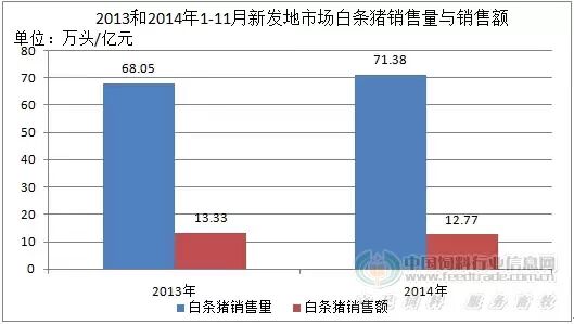根据北京新发地农产品批发市场刘通主任在第二届中国猪产业链风险预警年会上披露的数据,2014年1至11月新发地市场白条猪销售情况表现为量增价低。